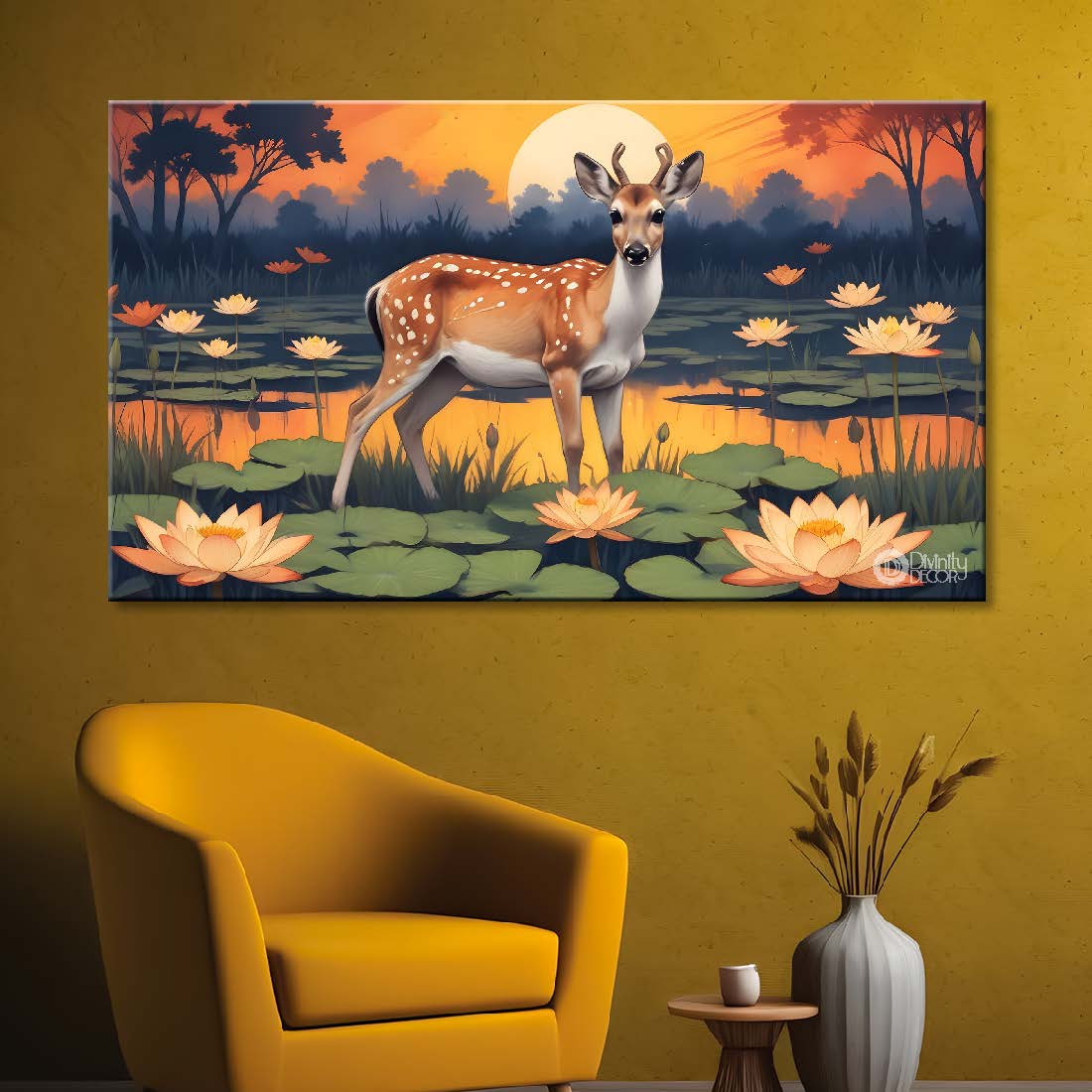 Deer with lotus in sunrise textured art.- Design - Animal -86 - Without Frame - Only Printed Canvas / 18x30 inch