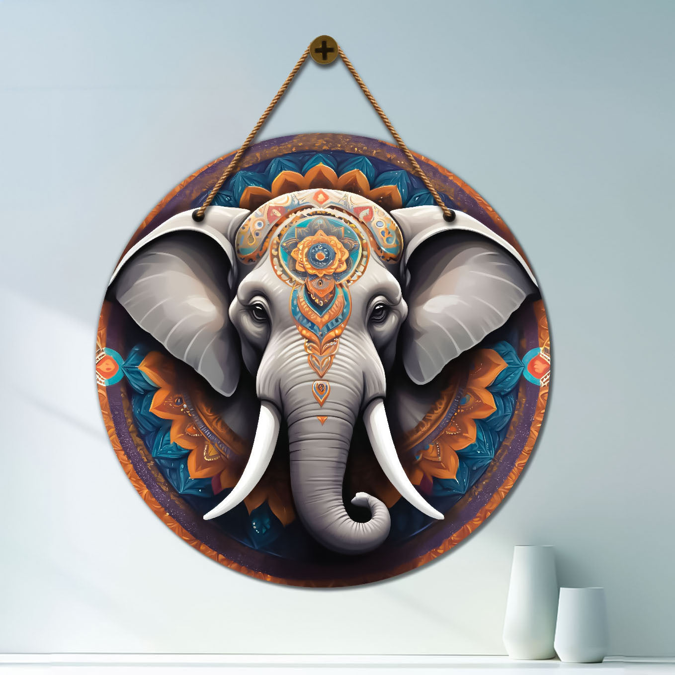 Elephant in grey and blue mandala Round Wooden Wall Hanging for wall Décor - Design - 334