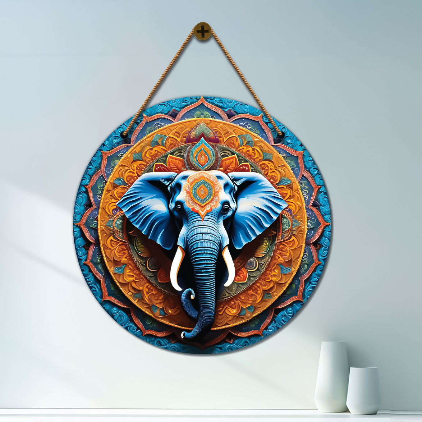 Elephant in orange and blue mandala Round Wooden Wall Hanging for wall Décor - Design - 04