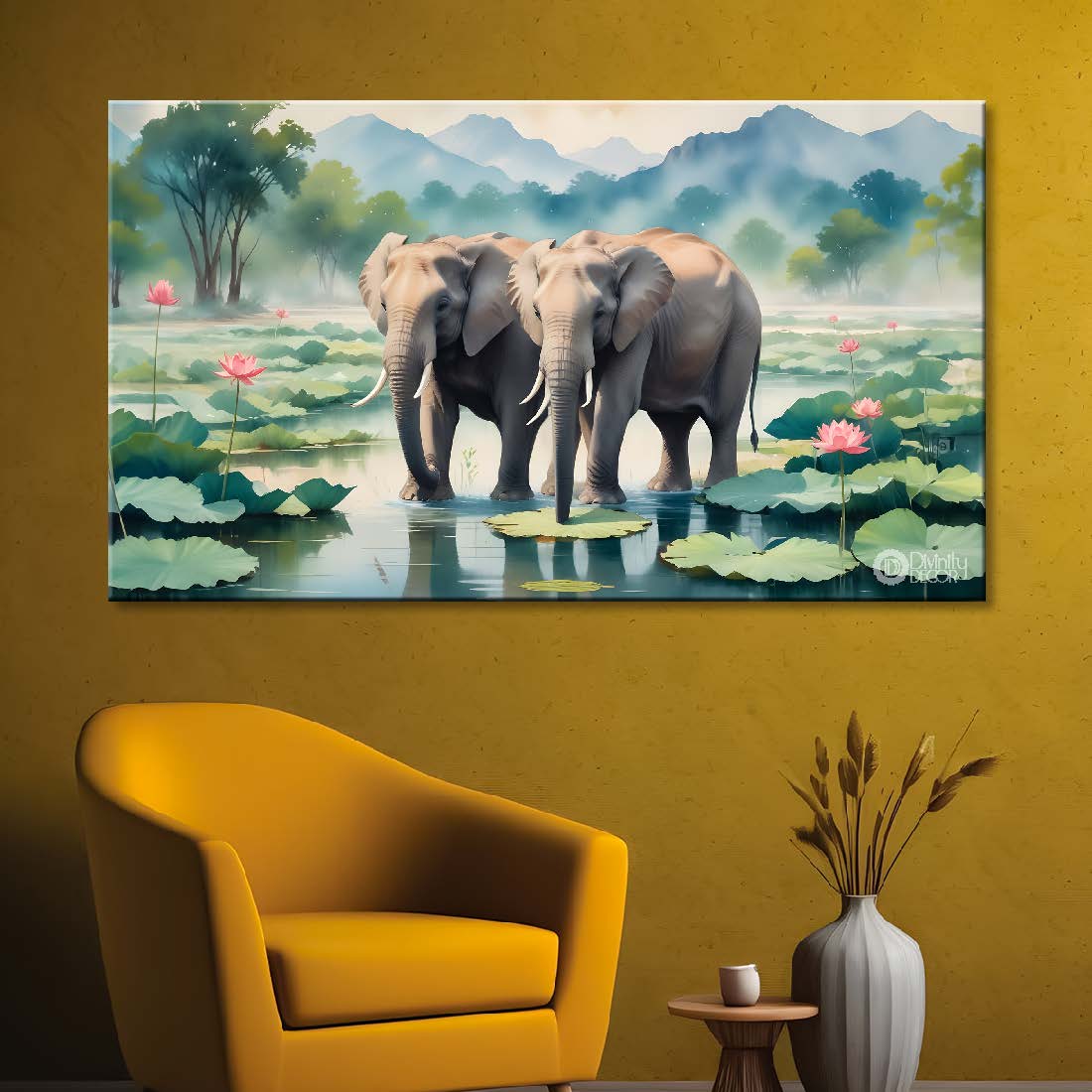 Elephant in the pond with trees and fog background textured art. - Design - Animal - 80 - Without Frame - Only Printed Canvas / 18x30 inch