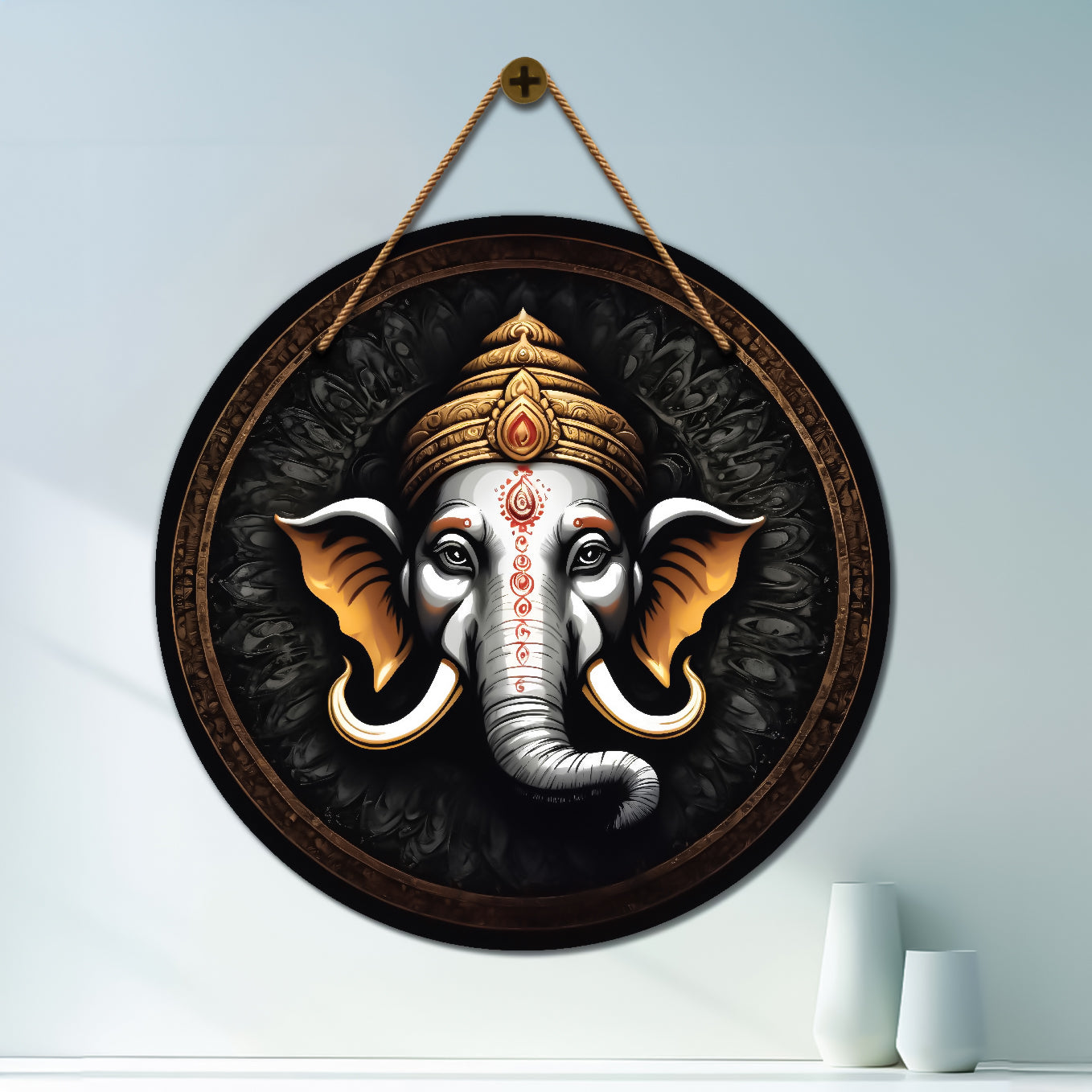 Ganesh Ji in black and grey mandala Round Wooden Wall Hanging for wall Décor - Design - 355