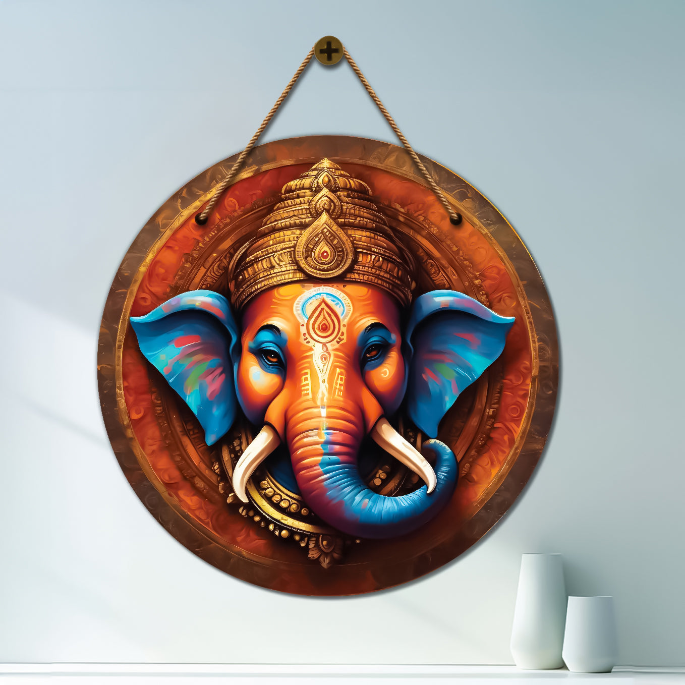 Ganesh Ji in blue and brown mandala Round Wooden Wall Hanging for wall Décor - Design - 346