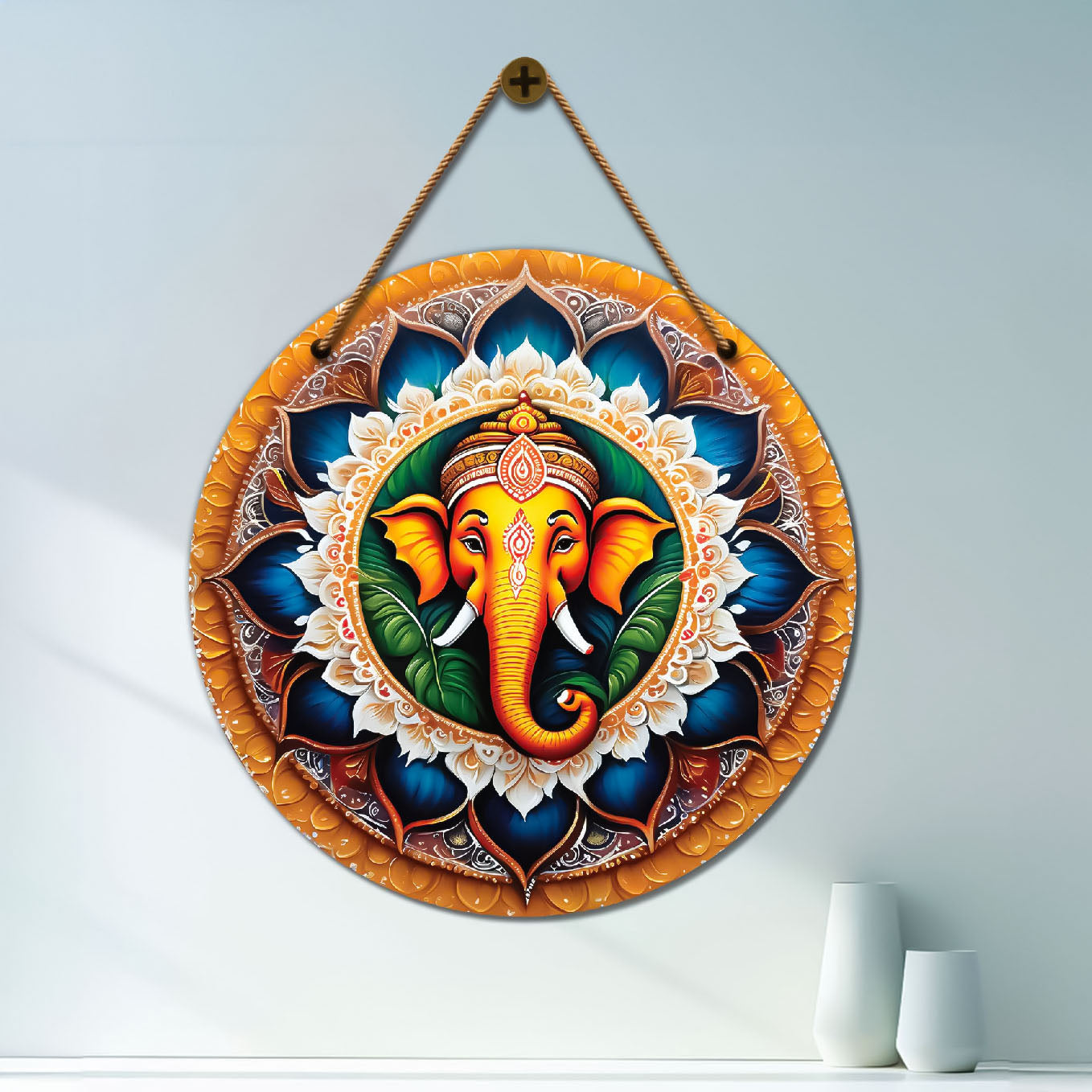 Ganesh Ji in blue and golden mandala Round Wooden Wall Hanging for wall Décor - Design - 120