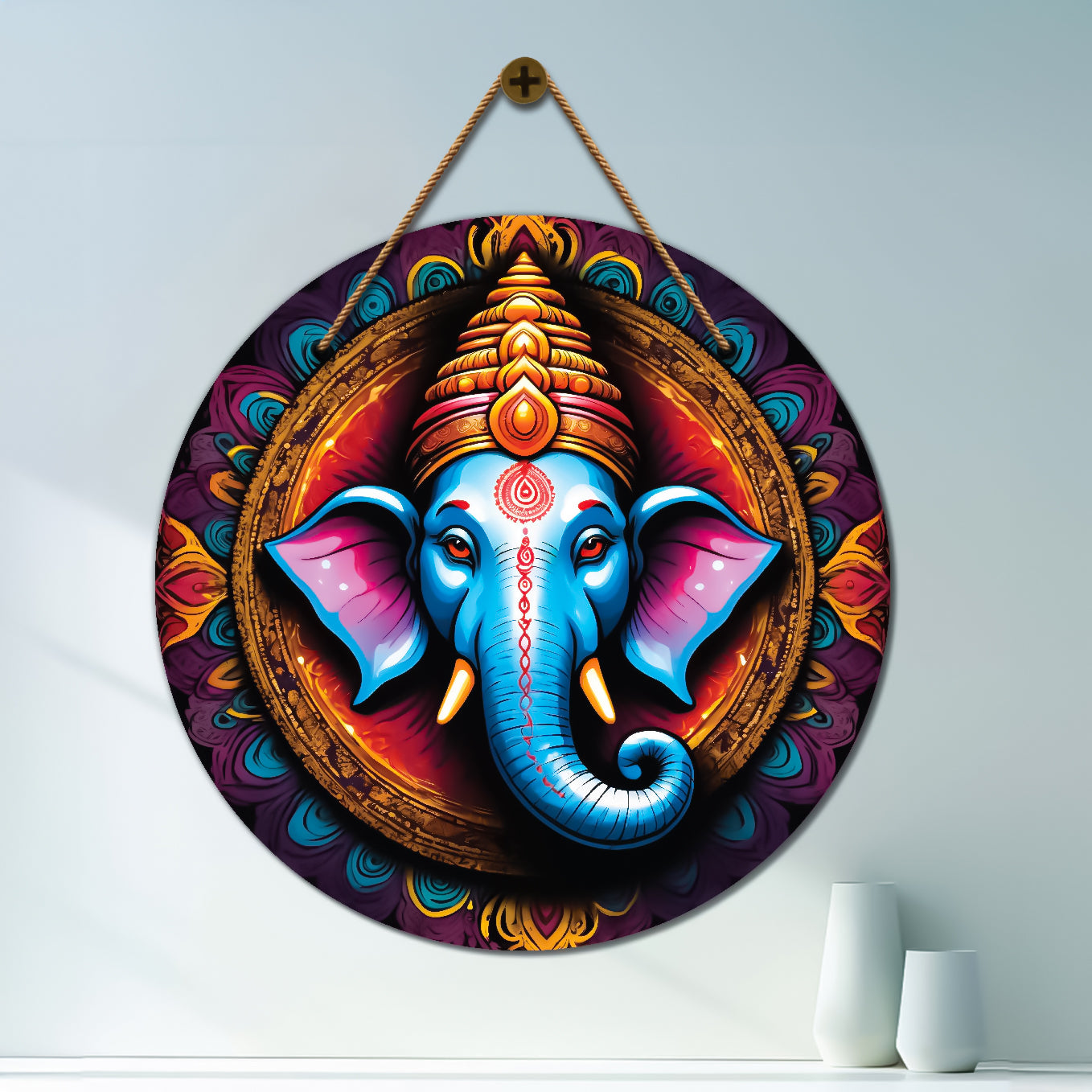 Ganesh Ji in blue and orange mandala Round Wooden Wall Hanging for wall Décor - Design - 344