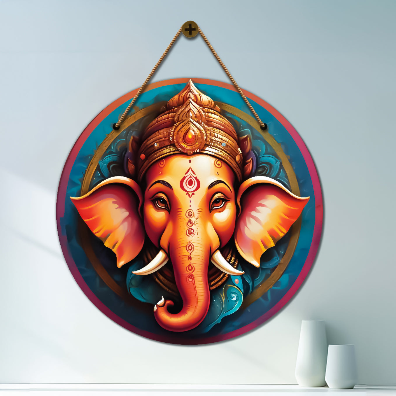 Ganesh Ji in blue and orange mandala Round Wooden Wall Hanging for wall Décor - Design - 350