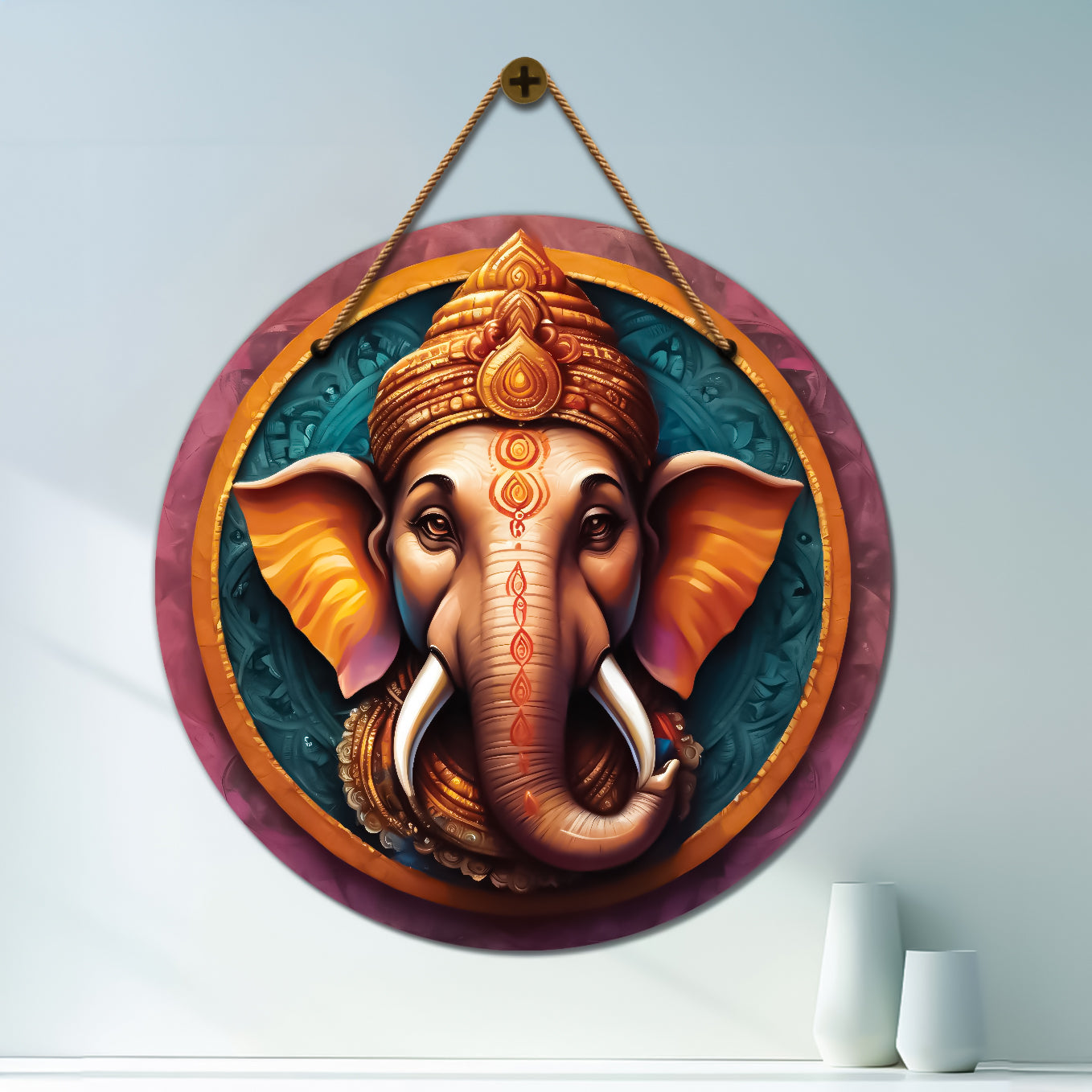 Ganesh Ji in blue and orange mandala Round Wooden Wall Hanging for wall Décor - Design - 351
