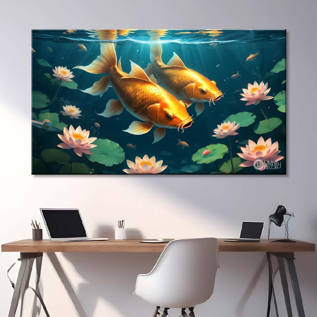 Gold fishes in the water with lotus textured art. - Design - Animal - 82 - Without Frame - Only Printed Canvas / 18x30 inch