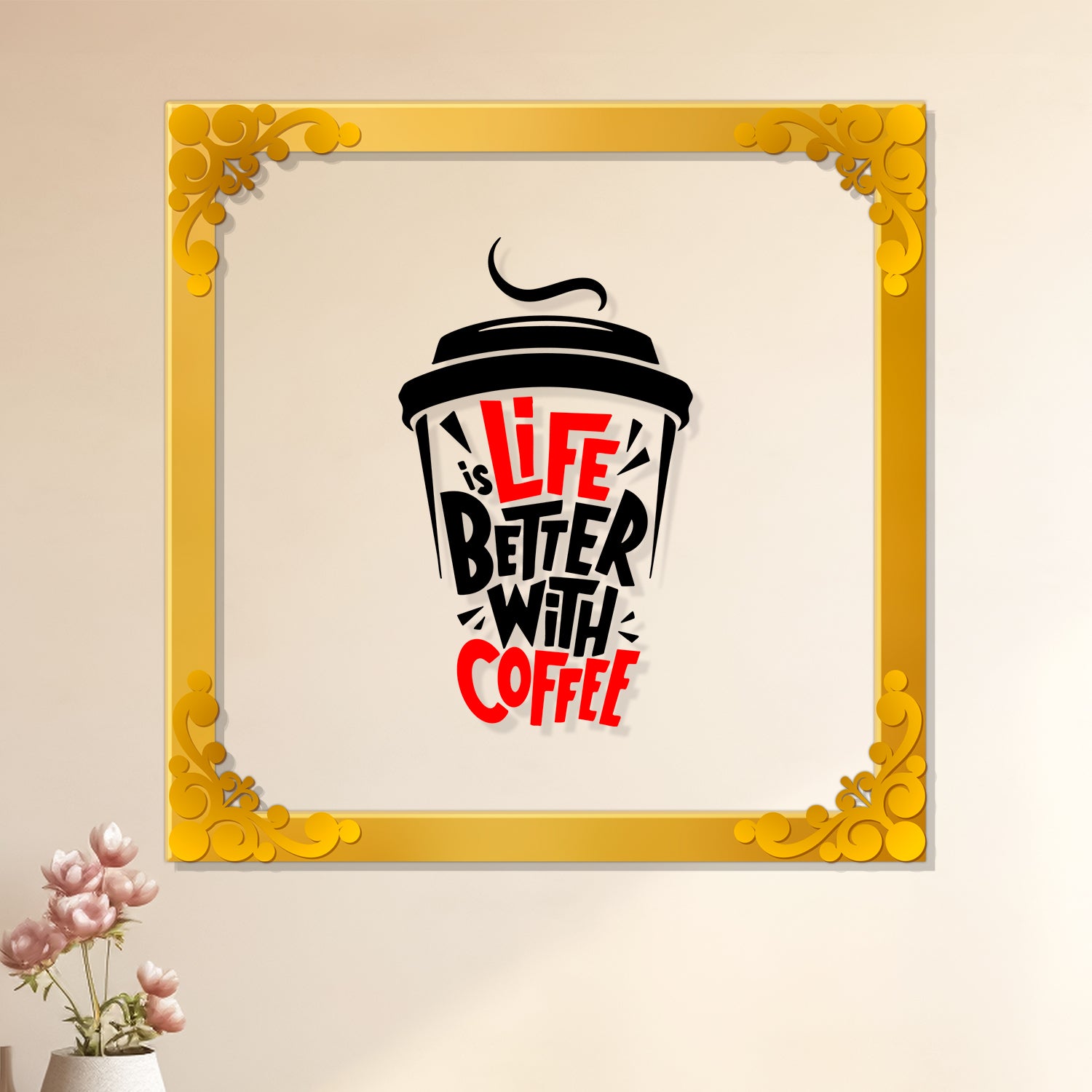Life better with coffee Golden Plaque for Gifting, Wall Decor Clear UV print with Golden Border-51 - 8x8 inch