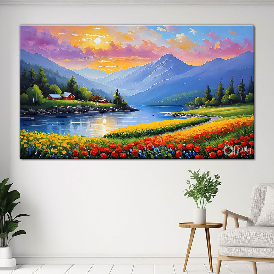 Mountains with river and flowers with sunset view textured painting Canvas Painting - Nature Art -100 - Without Frame - Only Printed Canvas / 18x30 inches
