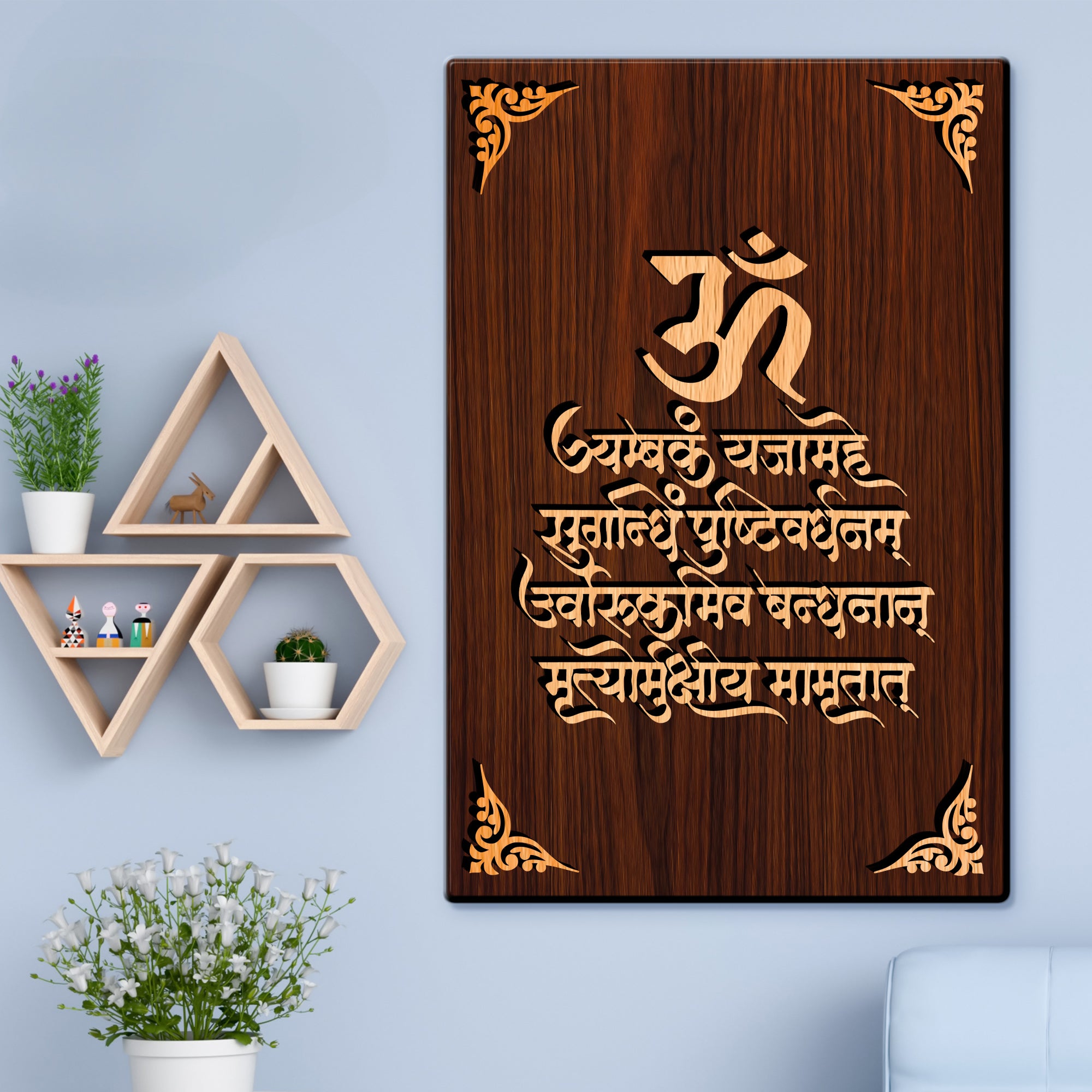Om Maha Mritunjaye Mantra For Gifting and Home Decor Wooden Wall Decor, Wall Hanging- 88 - 8x12