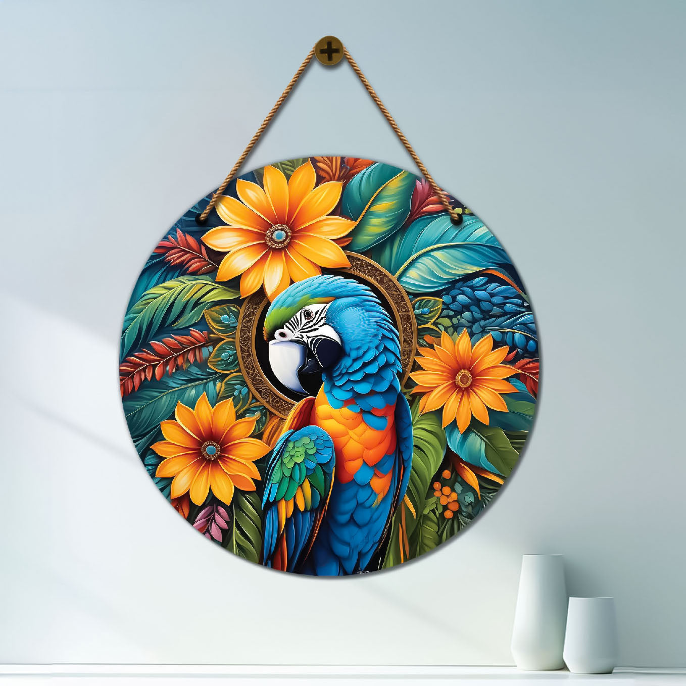 Parrot in green and yellow mandala Round Wooden Wall Hanging for wall Décor - Design - 173