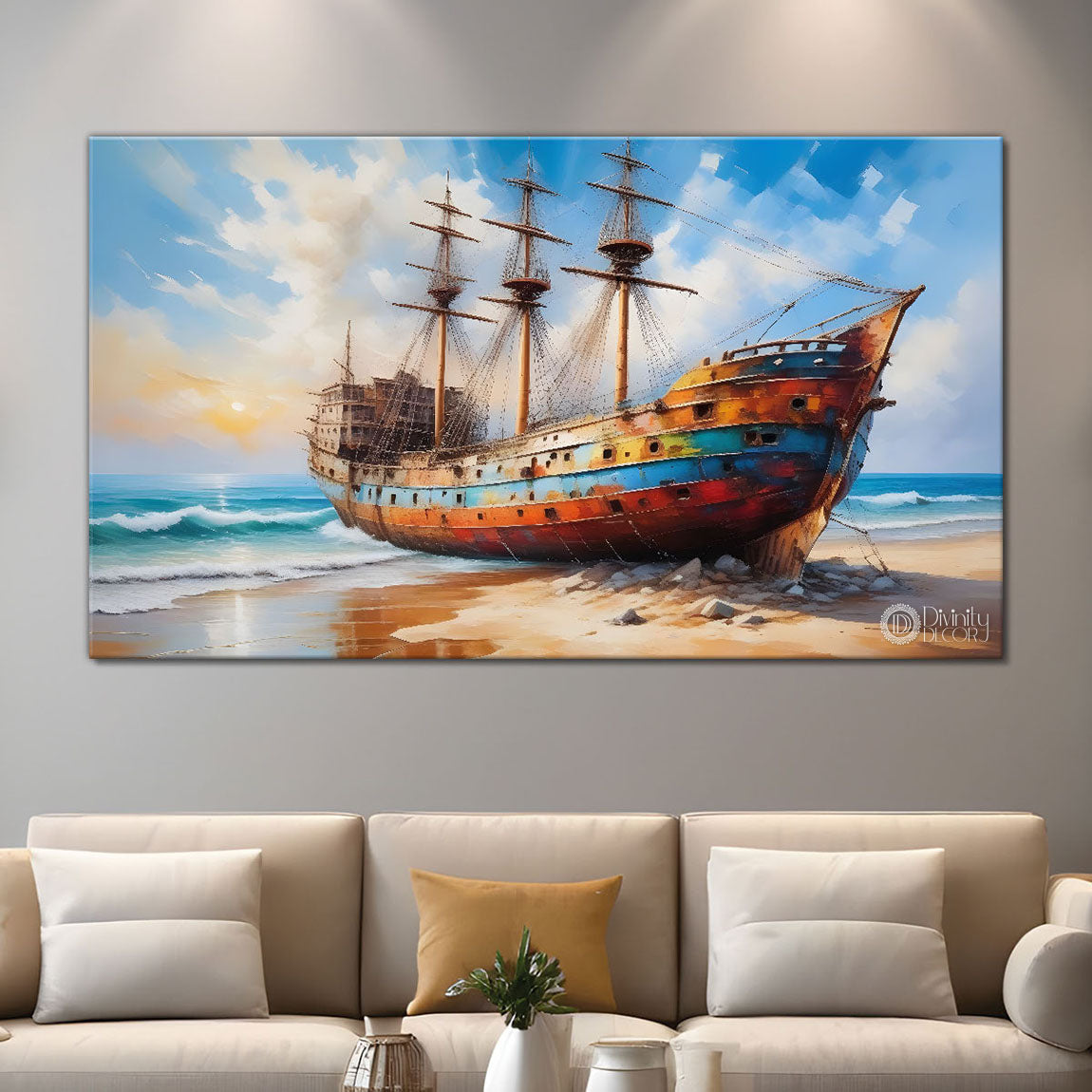 Ship in ocean textured modern art canvas painting - Design - River-2 - Without Frame - Only Printed Canvas / 18x30 inch
