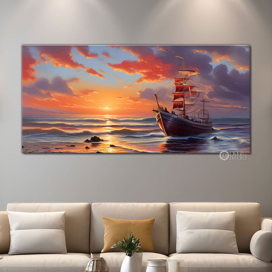 Ship in the sea with sunrise background textured modern art canvas painting - Design - River-51 - Without Frame - Only Printed Canvas / 18x30 inch