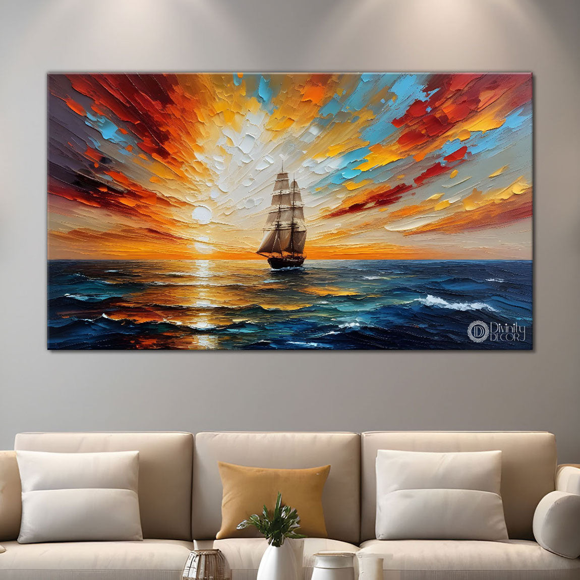 Ship with sunrise background in textured modern art canvas painting - Design - River-9 - Without Frame - Only Printed Canvas / 18x30 inch