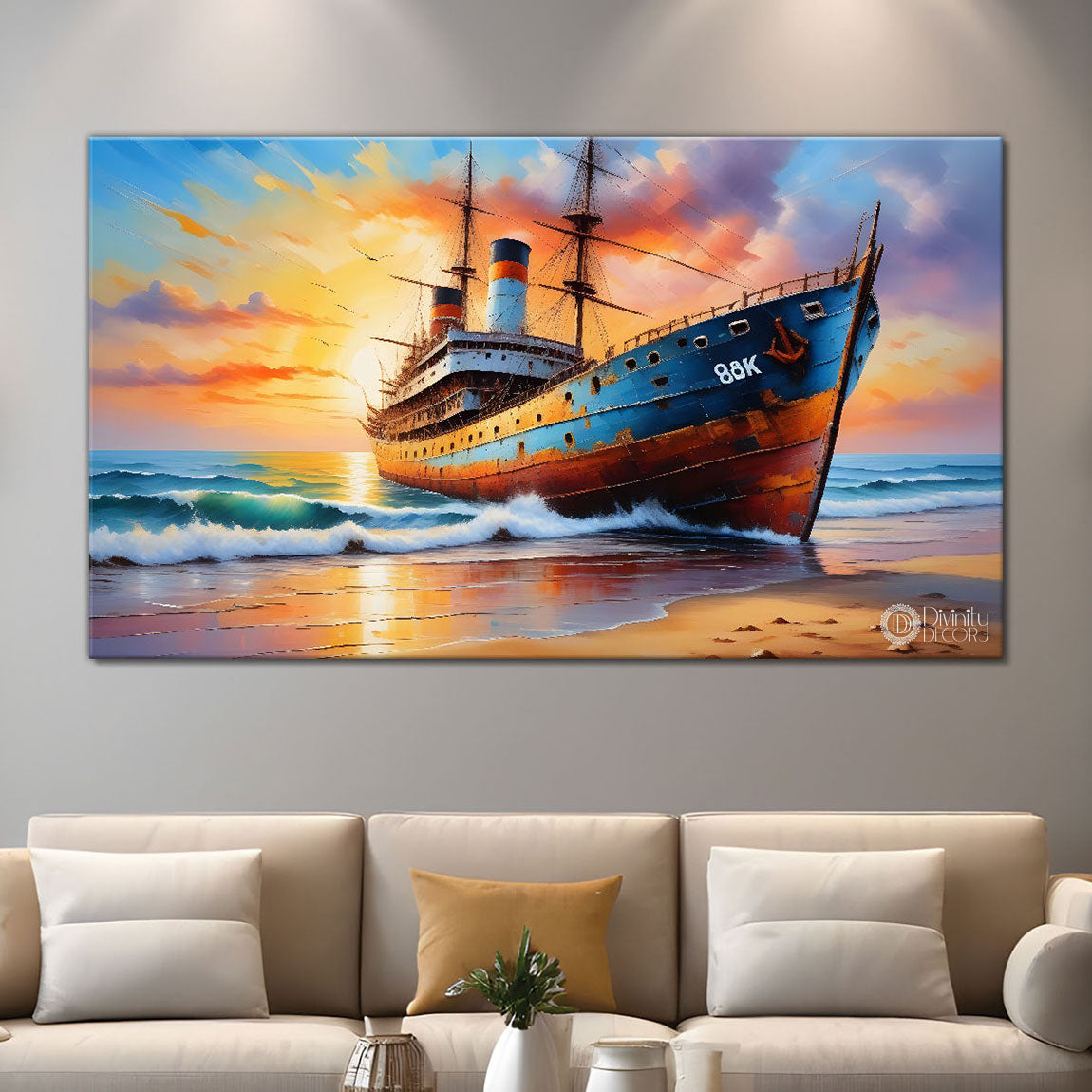 Ship with sunset background in textured modern art canvas painting - Design - River-3 - Without Frame - Only Printed Canvas / 18x30 inch