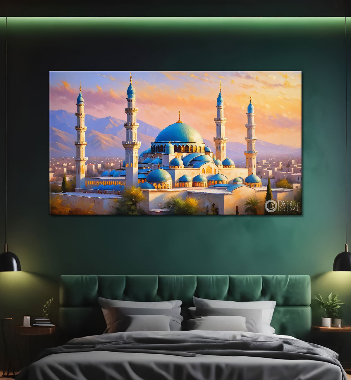 Beautiful Islamic mosque with sunset textured oil painting Canvas Painting - Islamic paintings - 61 - Without Frame - Only Printed Canvas / 18x30 inches