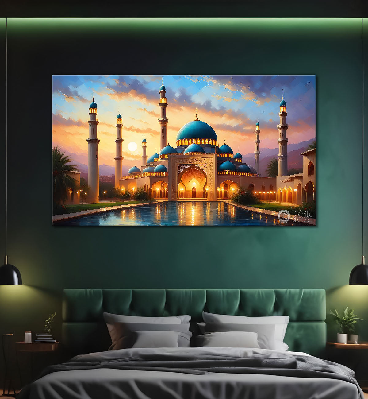 Beautiful Islamic mosque with sunset textured oil painting Canvas Painting - Islamic paintings - 68 - Without Frame - Only Printed Canvas / 18x30 inches