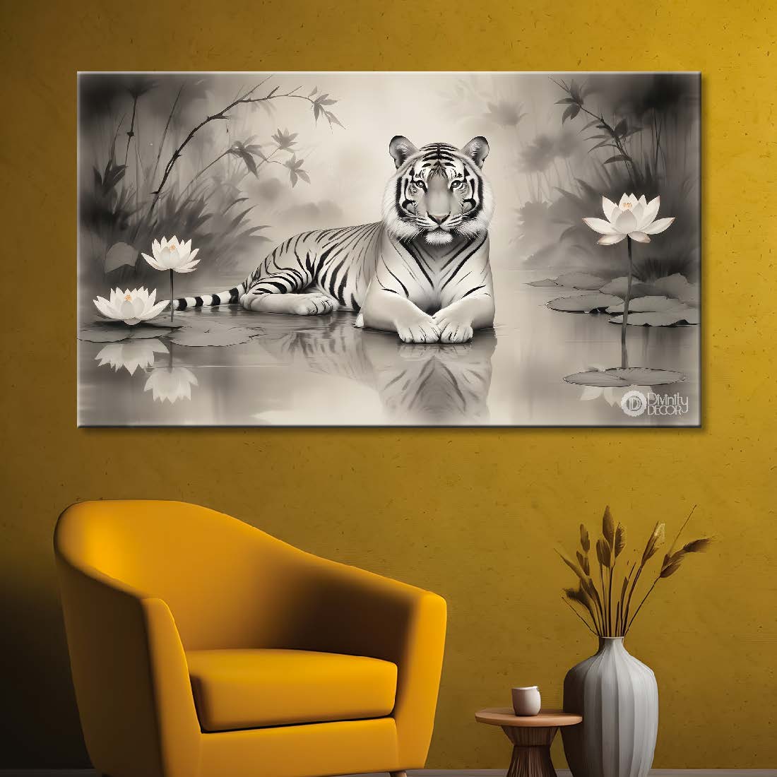 Black and White Tiger with white lotus and fog textured art.- Design - Animal -21 - Without Frame - Only Printed Canvas / 18x30 inch
