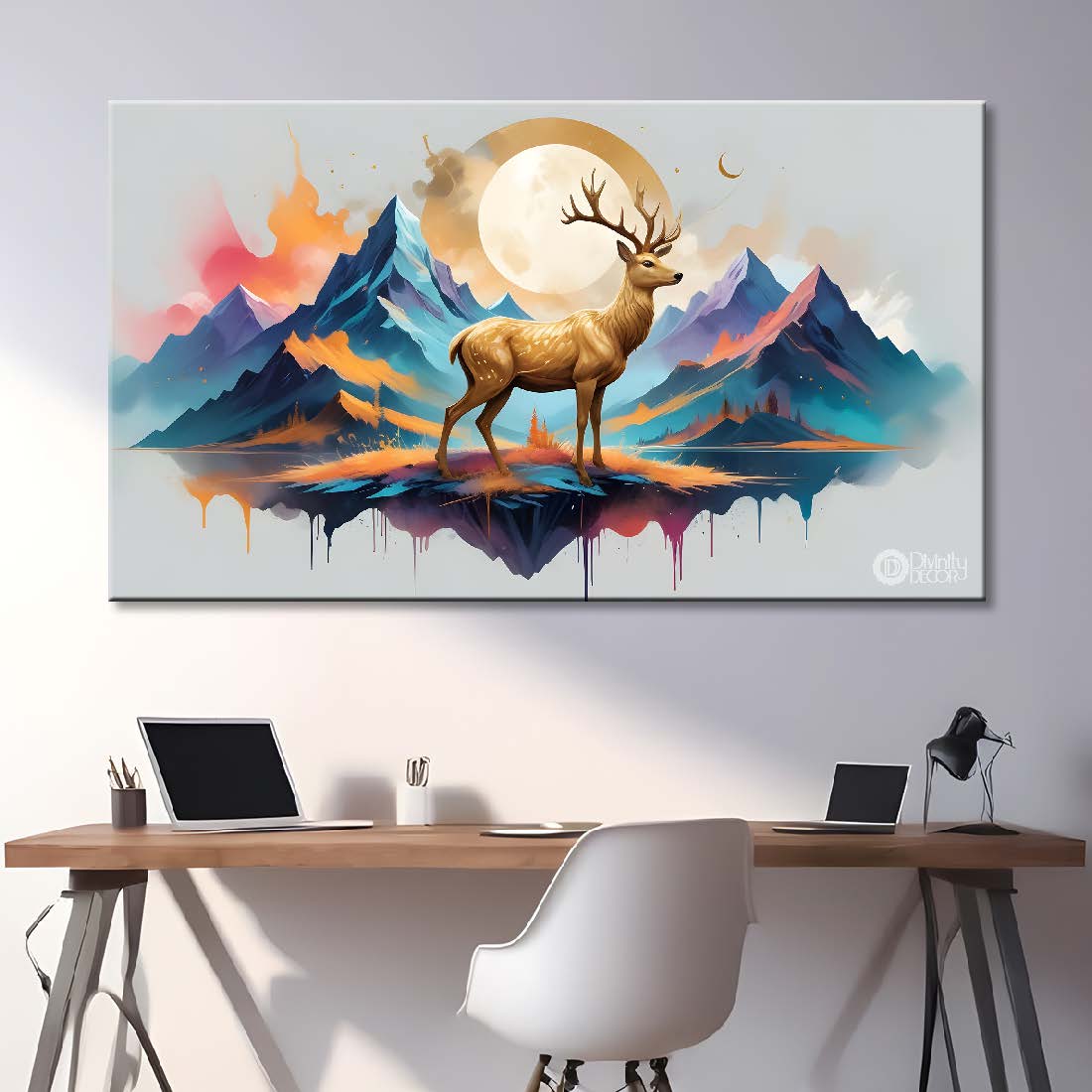Golden Deer with mountains and moon in textured art.- Design - Animal -15 - Without Frame - Only Printed Canvas / 18x30 inch