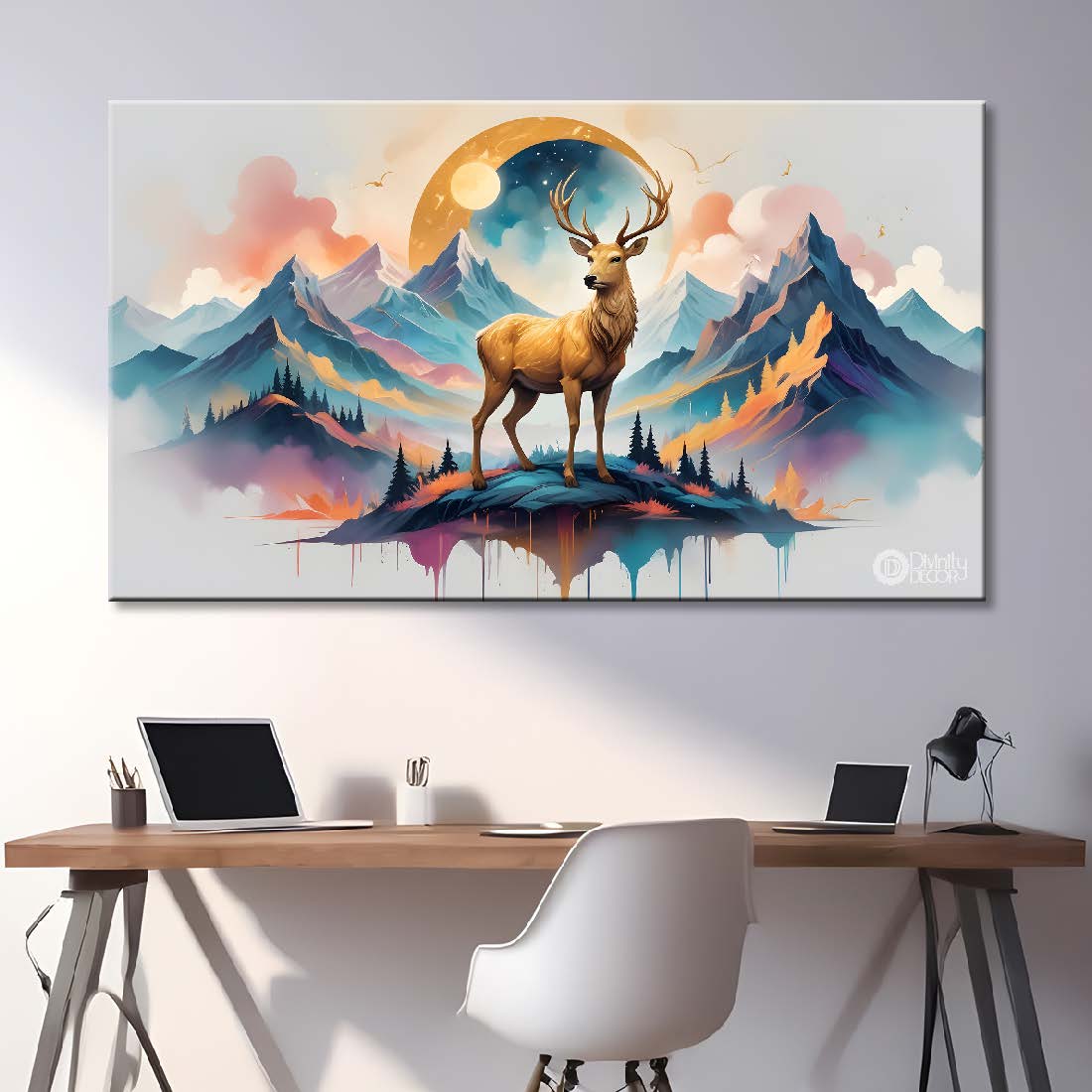 Golden Deer with mountains and moon in textured art.- Design - Animal -17 - Without Frame - Only Printed Canvas / 18x30 inch