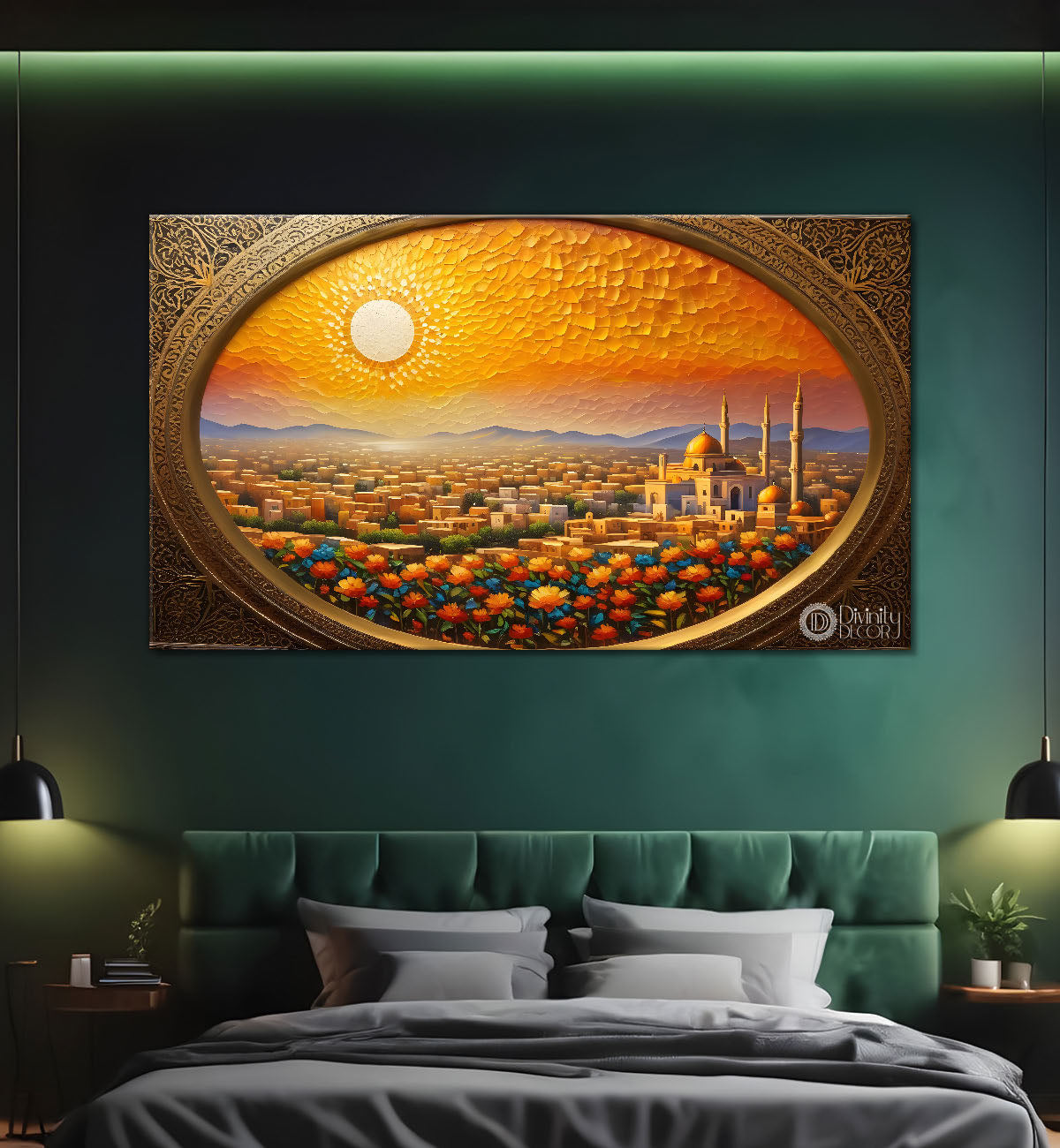 Islamic mosque in city with bright textured oil painting Canvas Painting - Islamic paintings - 27 - Without Frame - Only Printed Canvas / 18x30 inches