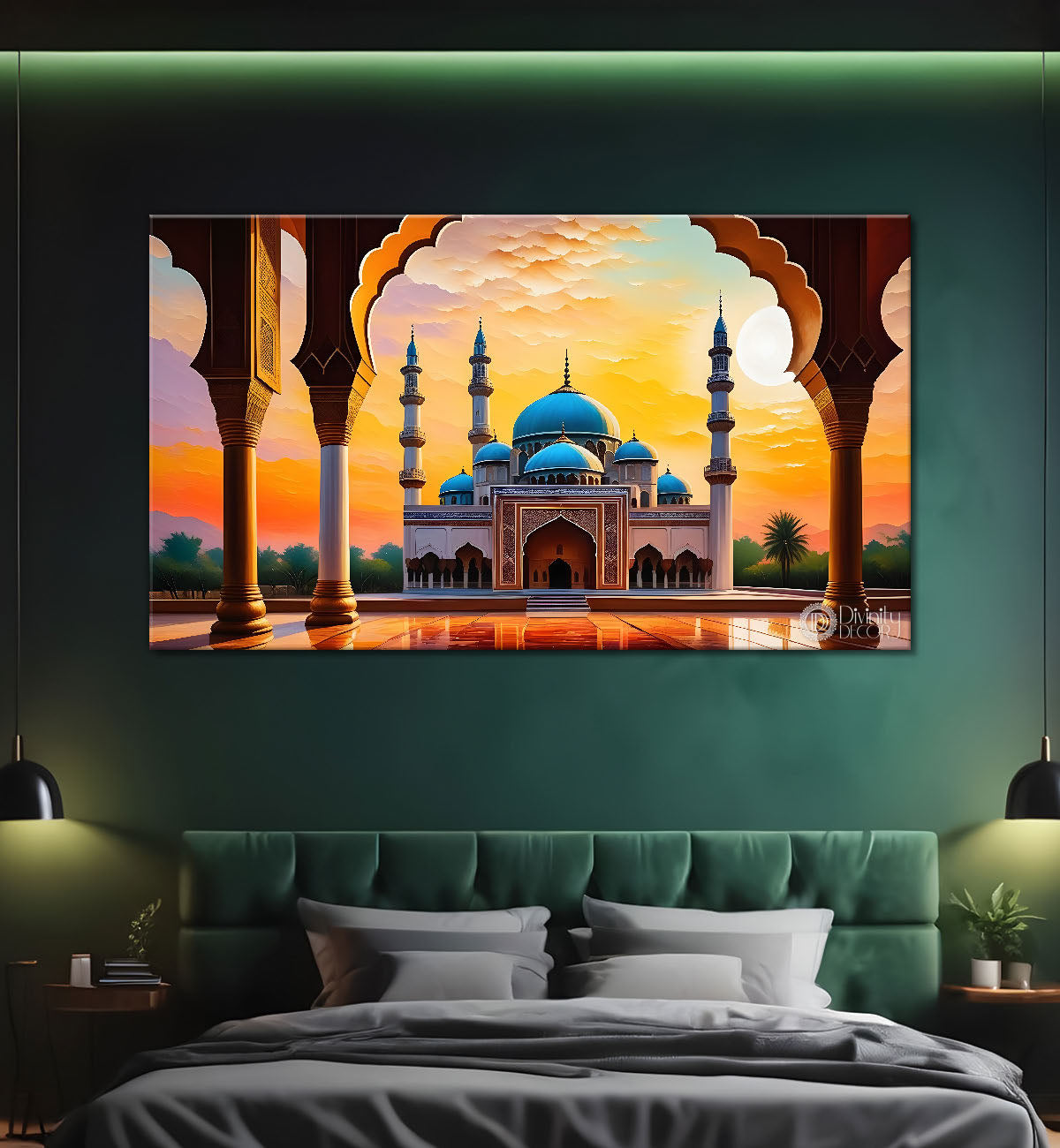 Islamic mosque with sunrise oil painting Canvas Painting - Islamic paintings - 53 - Without Frame - Only Printed Canvas / 18x30 inches