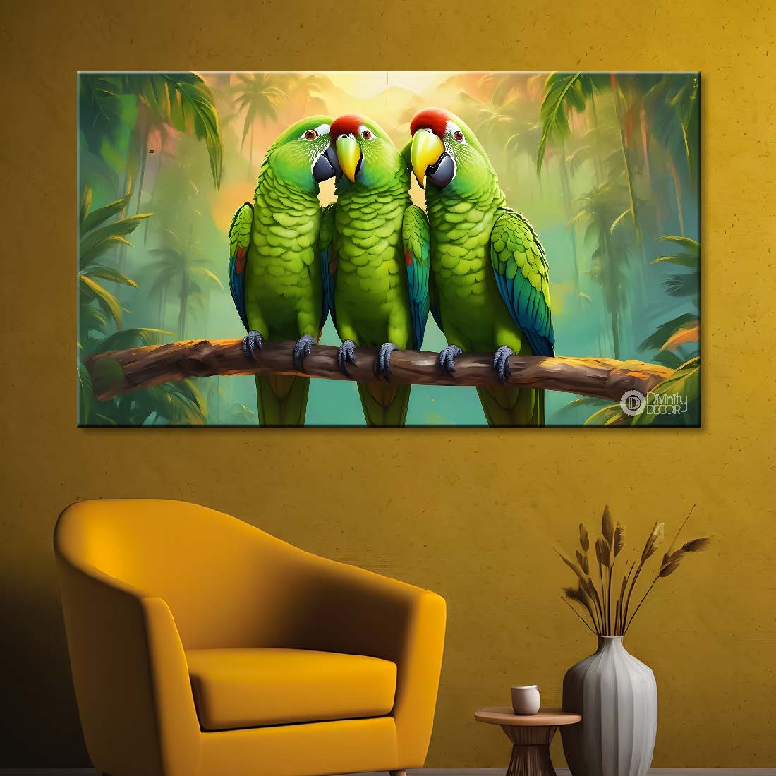 Three green parrots on the branch textured art. - Design - Animal - 121 - Without Frame - Only Printed Canvas / 18x30 inch