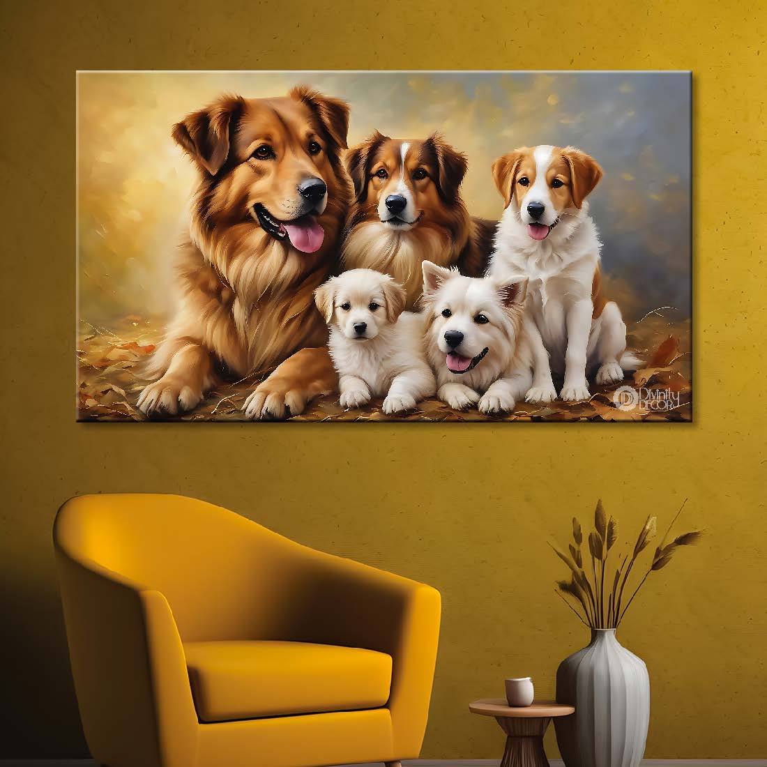 Two brown dogs with their three puppies textured art. - Design - Animal - 4 - Without Frame - Only Printed Canvas / 18x30 inch