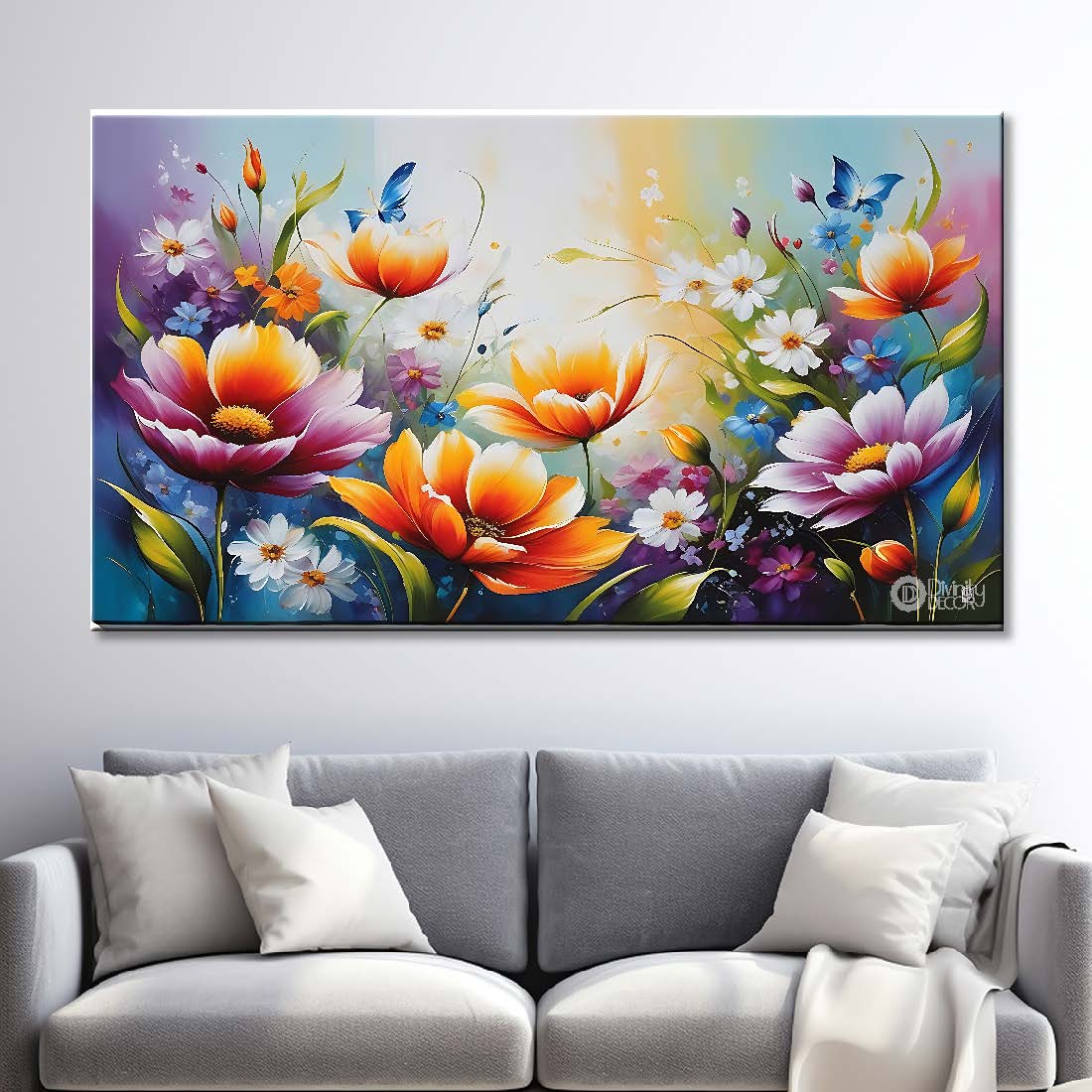 Colorful flowers in blue background canvas painting- Flower-608 - Without Frame - Only Printed Canvas / 18x30 inches