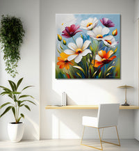 Colourful flower in blue textured painting Flower-S-513 - Without Frame - Only Printed Canvas