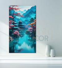 Pink trees with mountains,japanes houses and lake in aqua background in textured natural art Canvas Painting - Nature Art -V-166 - Without Frame - Only Printed Canvas / 18x30 inches