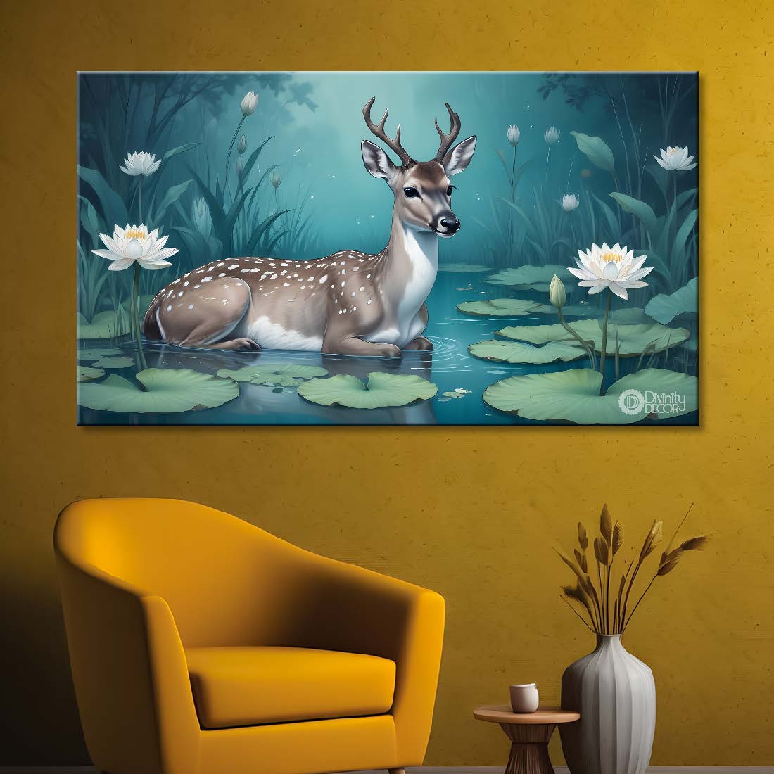 Grey deer with lotus and green background textured art.- Design - Animal -47 - Without Frame - Only Printed Canvas / 18x30 inch
