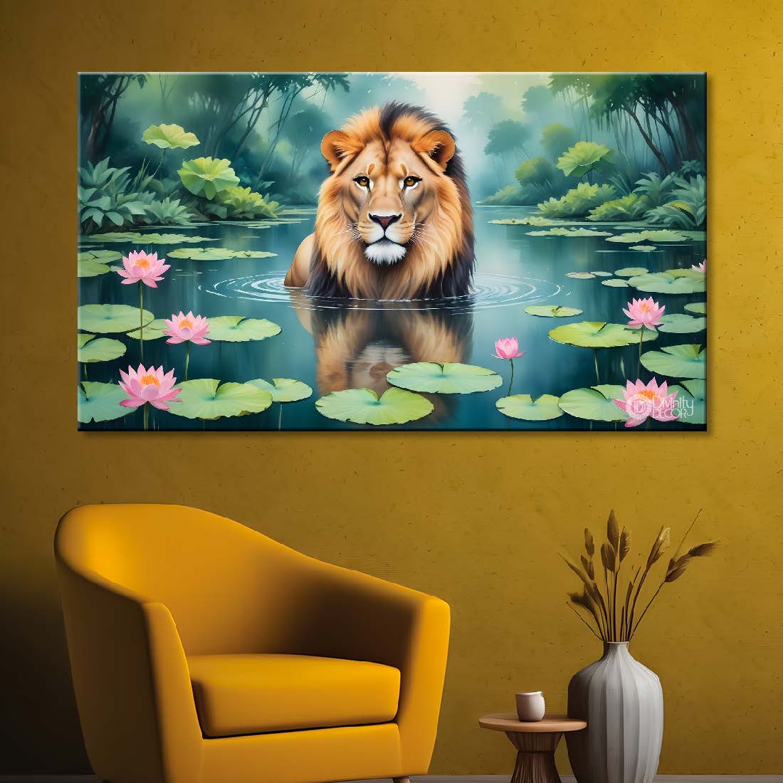 Lion in the pond with green background textured art. - Design - Animal -75 - Without Frame - Only Printed Canvas / 18x30 inch