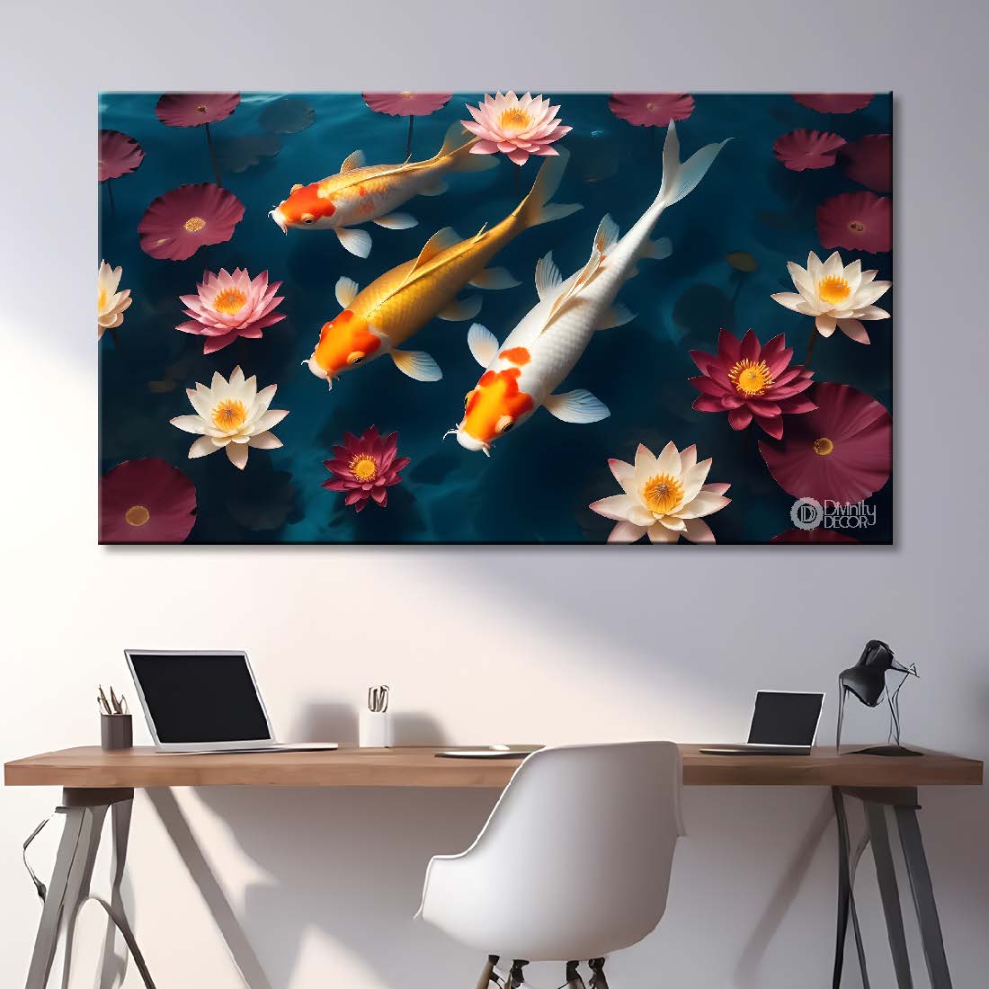 Three koi fishes in the water with flowers textured art. - Design - An – Divinity Decor index