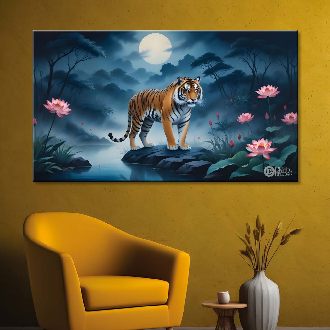 Tiger with lotus and trees in night background textured art.- Design - Animal -54 - Without Frame - Only Printed Canvas / 18x30 inch