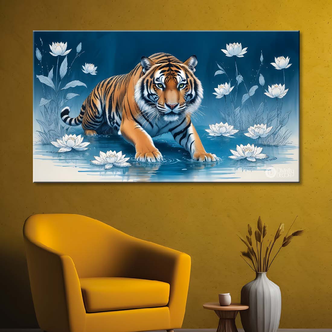 Tiger with white flowers in blue textured art.- Design - Animal -109 - Without Frame - Only Printed Canvas / 18x30 inch