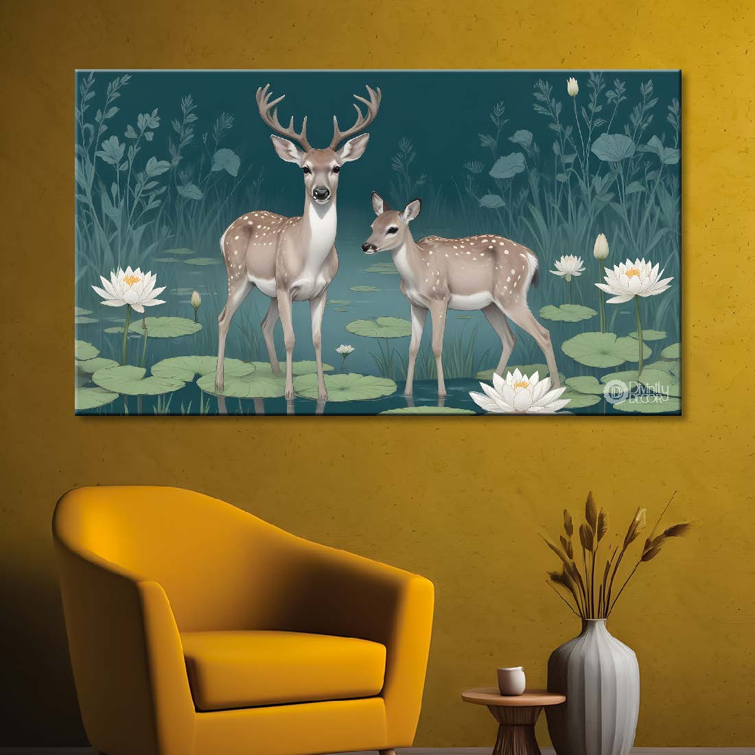 Two deer with white lotus in green background textured art.- Design - Animal -55 - Without Frame - Only Printed Canvas / 18x30 inch