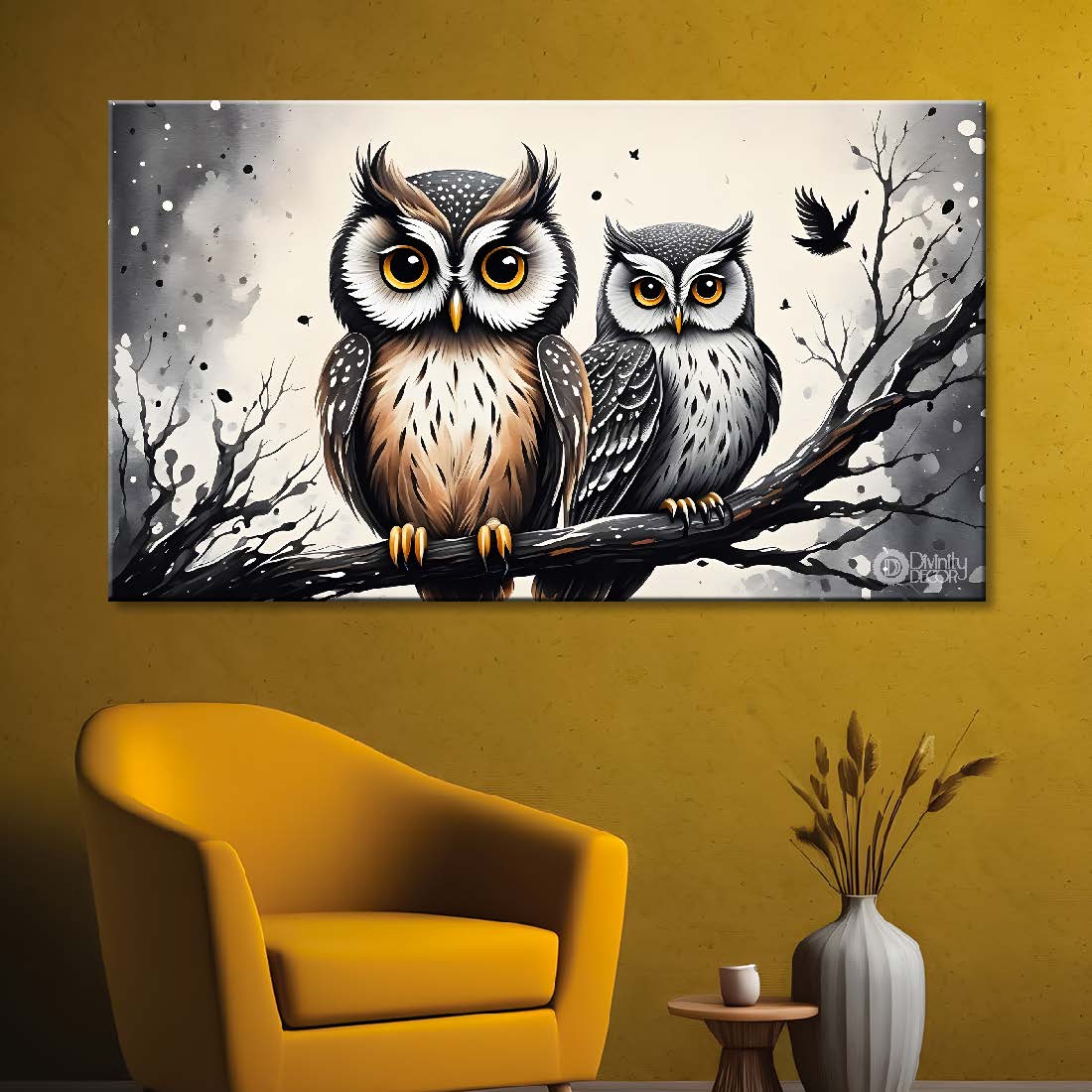 Two owls on the branch with grey background textured art. - Design - A – Divinity Decor index