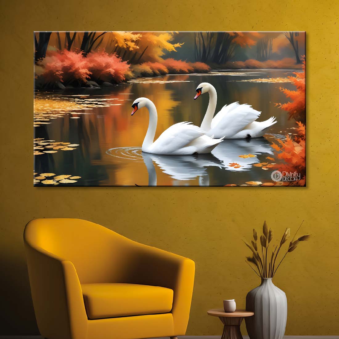Two Swans floating in orange and yellow tree textured art. - Design - Animal -24 - Without Frame - Only Printed Canvas / 18x30 inch