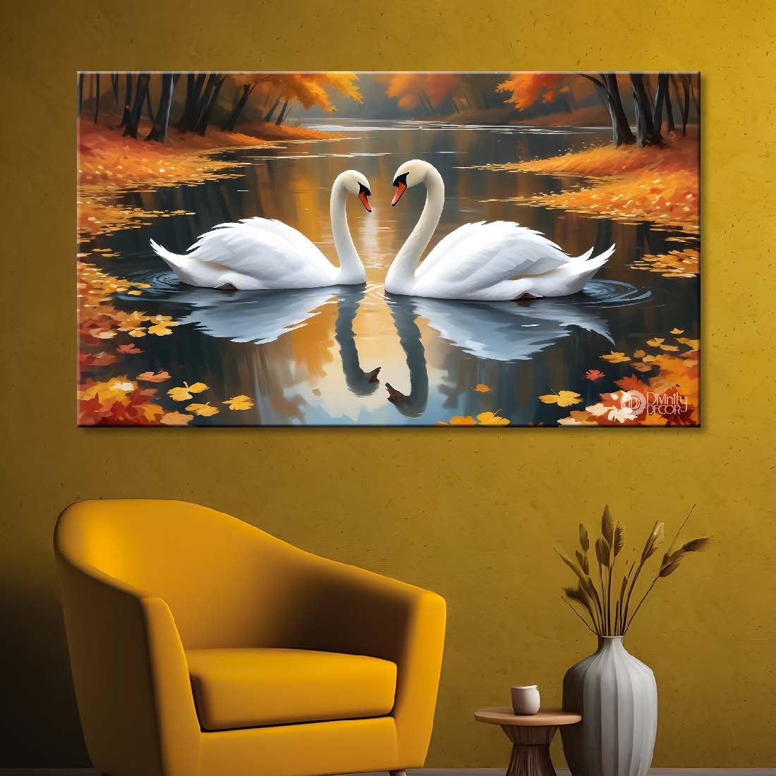 Two Swans floating with orange background textured art - Design - Animal -37 - Without Frame - Only Printed Canvas / 18x30 inch