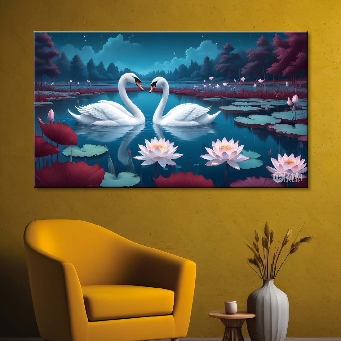 Two white Swans in the pond in blue textured background art. - Design - Animal - 85 - Without Frame - Only Printed Canvas / 18x30 inch