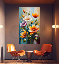 Colourful flowers in light blue textured painting - Flower-V-85 - Without Frame - Only Printed Canvas / 18x30 inches