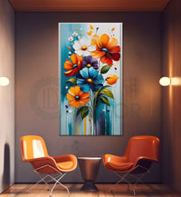 Colourful flowers with light blue textured painting- Flower-V-146 - Without Frame - Only Printed Canvas / 18x30 inches