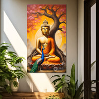Golden buddha sitting on lotus with trees,peacock and orange background textured painting - Buddha-V-2 - Without Frame - Only Printed Canvas / 18x30 inch