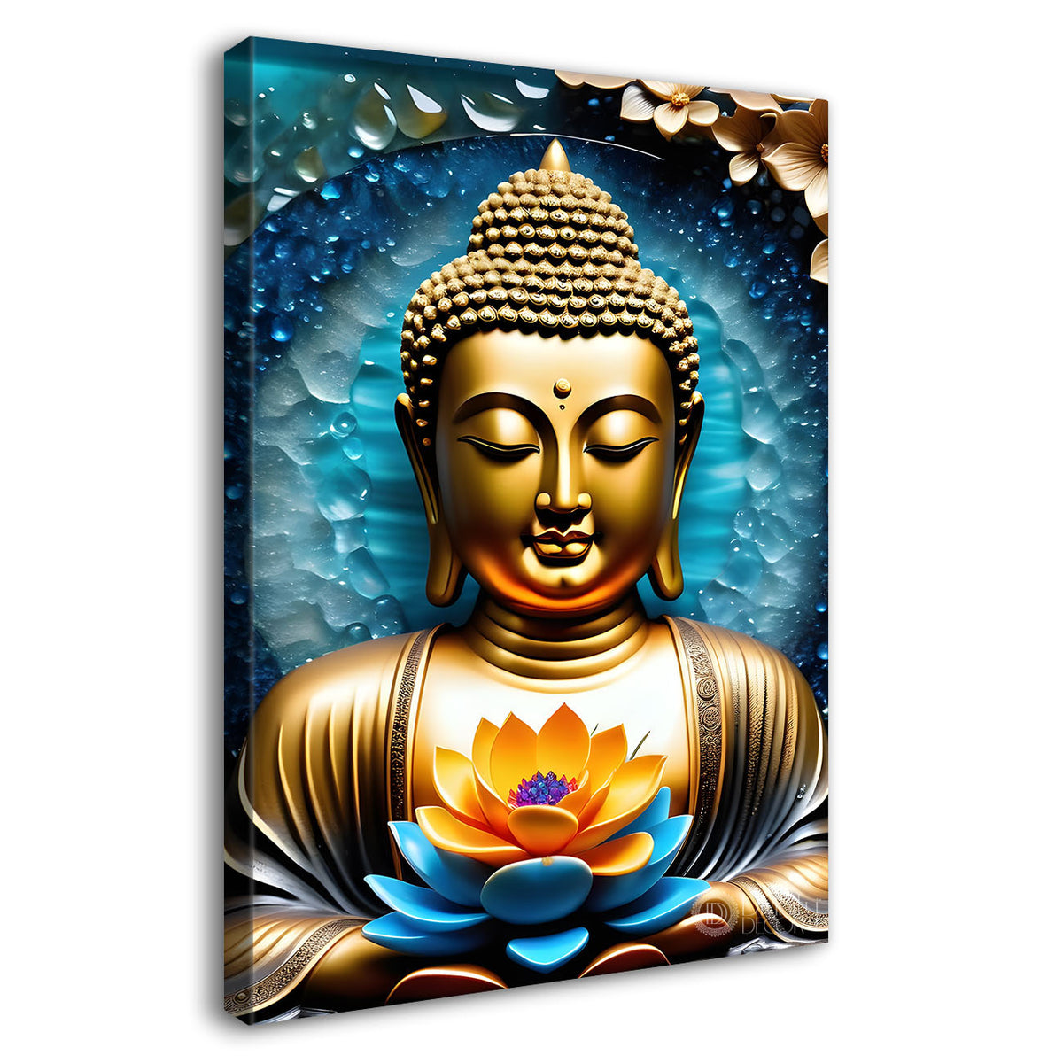 Golden buddha with blue background painting - Buddha-V-57 - Without Frame - Only Printed Canvas / 18x30 inch