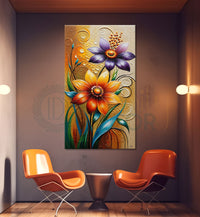 Orange and purple flowers in light brown textured painting- Flower-V-421 - Without Frame - Only Printed Canvas / 18x30 inches
