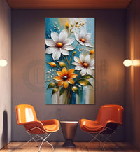 Orange and white flowers in blue textured background painting - Flower-V-63 - Without Frame - Only Printed Canvas / 18x30 inches