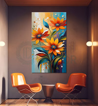 Orange flowers in grey textured background painting - Flower-V-84 - Without Frame - Only Printed Canvas / 18x30 inches