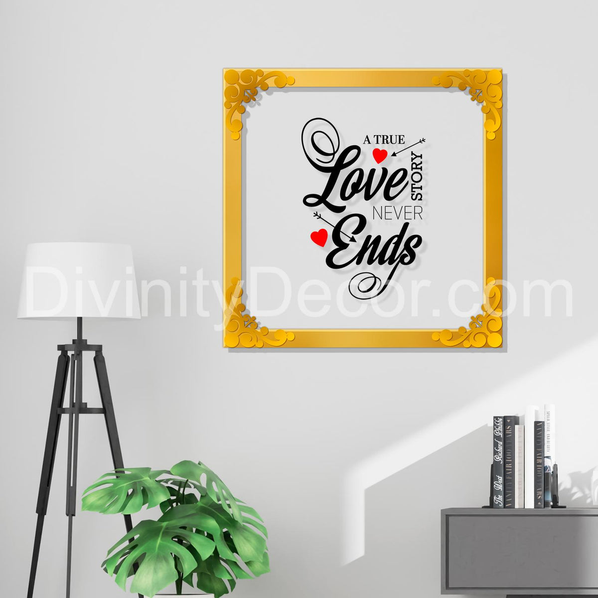 A true love story never ends Golden Plaque for Gifting, Wall Décor Clear UV print with Golden Border-292 - 8x8 inch
