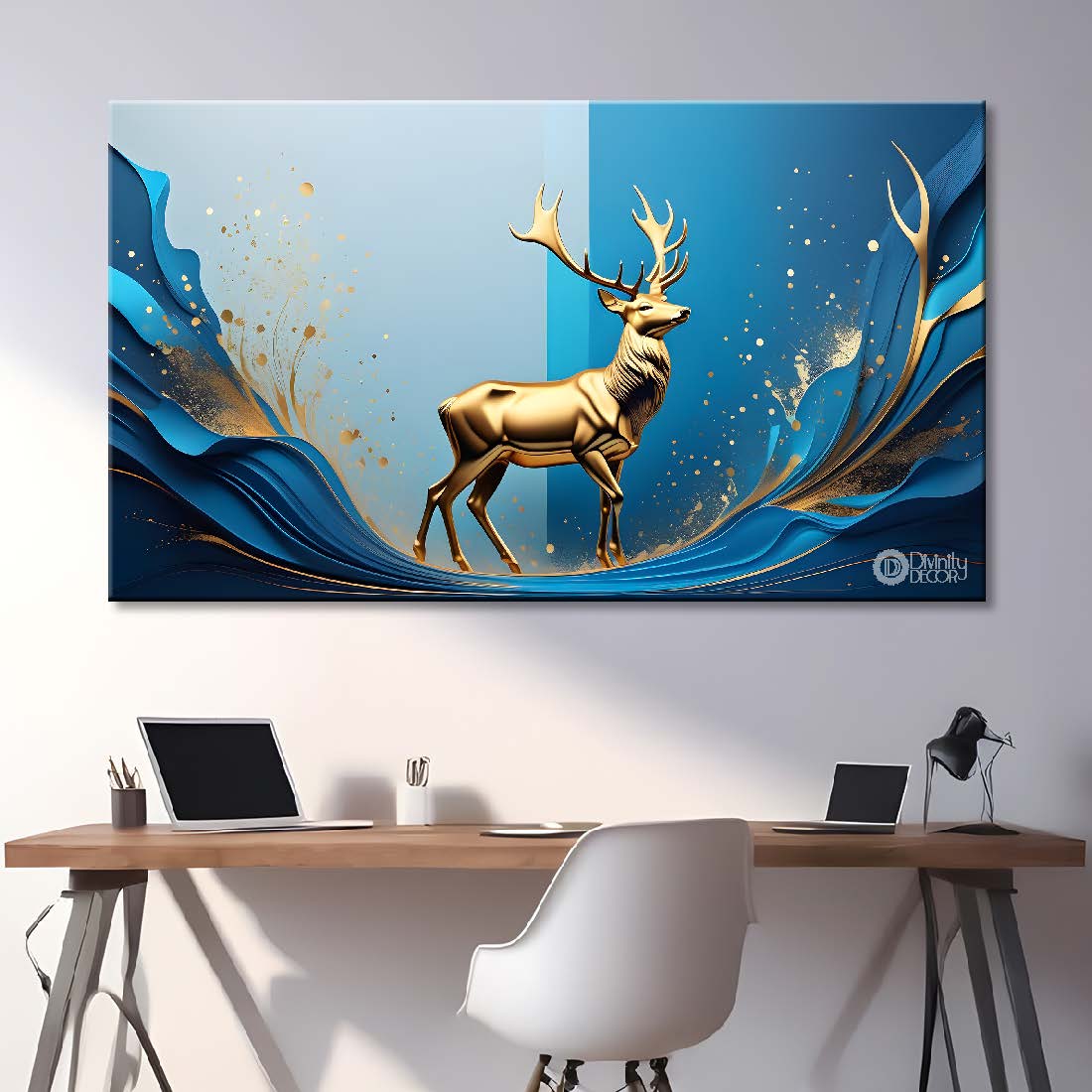 Golden deer with blue background textured art.- Design - Animal -133 - Without Frame - Only Printed Canvas / 18x30 inch